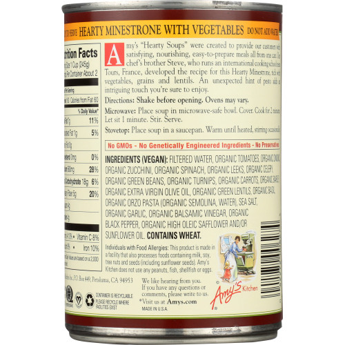 AMY'S: Organic Hearty Minestrone with Vegetables Soup, 14.1 oz
