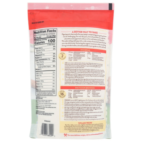 Arrowhead Mills Organic Rye Flour adds a warm color, slightly nutty flavor and a toothsome texture to baked goods. Due to its low gluten content, it works well in tender pastries like cookies, biscuits and cakes. It goes especially well with dark chocolate, ginger, brown butter and cinnamon.