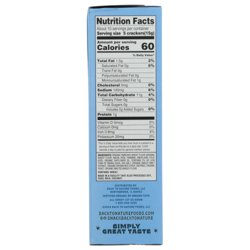 Back to Nature Organic Classic Saltine Crackers are light, crisp, and oven-baked crackers made with USDA Organic ingredients for a clean, classic flavor and satisfying crunch. Crafted without artificial flavors, colors, or preservatives, these crackers offer a wholesome take on the traditional saltine, lightly seasoned with salt for a simple, savory taste.
