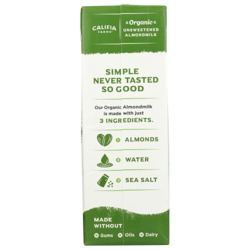 Califia Farms Organic Unsweetened Almondmilk offers plant-based purity in its simplest form. Crafted with just three clean ingredientsâpurified water, organic almonds, and sea saltâit delivers a smooth, homemade taste without the use of oils, gums, or thickeners like carrageenan. Because it is unsweetened and free from artificial additives, it serves as a versatile, low-calorie staple for health-conscious kitchens.