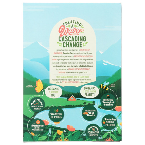 Cascadian Farm Organic Purely O's Cereal features O-shaped cereal pieces made with whole-grain oats and barley. Enjoy this tasty organic cereal with milk, sprinkle on top of oatmeal, your favorite yogurt or ice cream, or enjoy by the handful as a crunchy, on-the-go snack. With 31 grams of whole grain* and 4 grams of fiber per serving, it's a delicious addition to your day. This tasty breakfast cereal will be a hit for the whole family. *31g whole grain per serving. At least 48g recommended daily. Always Organic. Never Ordinary. Thatâs been our mantra since 1972. Since then, weâve remained a producer of organic cereals, fruits, vegetables, granola and snack bars. Cascadian Farm is a pioneering supporter of farmers who use practices that regenerate the land and their communities.