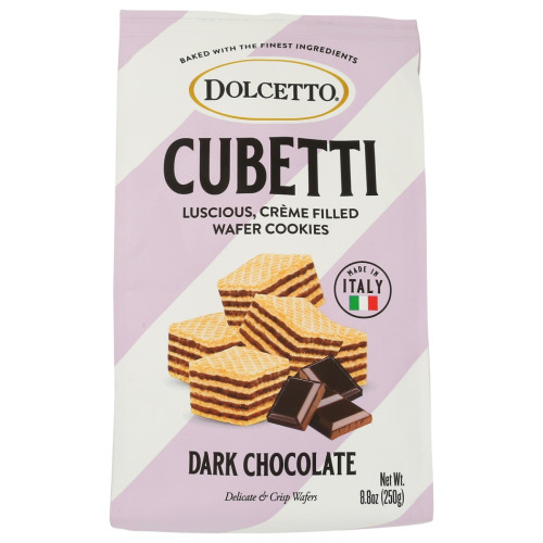 Dolcetto Cubetti wafers are crafted in Italyâs countryside by artisanal bakers whose mission is to bring you Cubettiâs signature texture and taste â light and crisp with a creamy richness that melts in your mouth. Our bakers select the finest Italian ingredients for our delicate wafer cookies and bake them to golden perfection. The dark chocolate, carefully blended to achieve a balanced smoothness and creamy taste, is gently folded in between 5 layers of delicately crisp wafers.