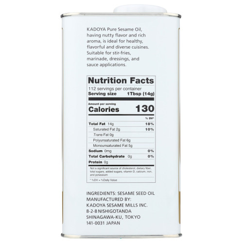 KADOYA PURE SESAME OIL is made from carefully selected sesame seeds. We are roasting and pressing them carefully for producing its special rich aroma.