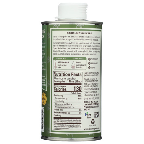 La Tourangelle Extra Virgin Olive Oil is cold pressed from olives that are harvested early in the season in AndalucÃa, Spain. Processing shortly after harvest preserves the naturally high antioxidant levels and yields a well-balanced, extra fresh oil, that is bright, peppery, and ideal for daily cooking.