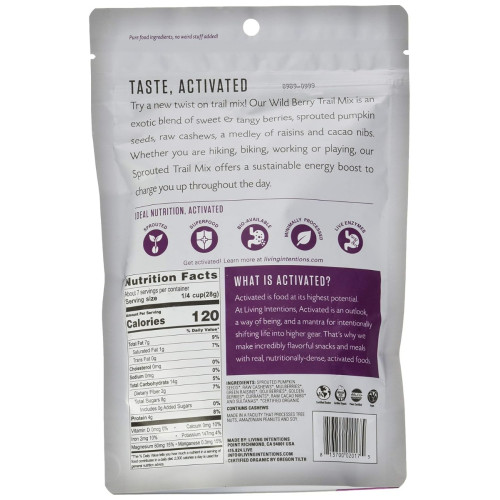 Try a new twist on trail mix! Our Wild Berry Trail Mix is an exotic blend of sweet & tangy berries, sprouted pumpkin seeds, raw cashews, a medley of raisins and antioxidant-rich cacao nibs. Whether you are hiking, biking, working or playing, our Sprouted Trail Mix offers a sustainable energy boost to charge you up throughout the day.