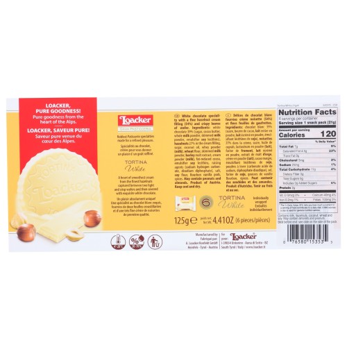 Itâs time for white pleasure! The white chocolate reveals a delicious hazelnut cream filling between two crispy wafers. For our cream, we use only 100% Italian hazelnuts. Our sustainable program "Italian Hazelnut Orchards" allows us to guarantee the high quality of our hazelnuts, while assisting the local economy and the farmers' families. This Tortina White evokes incredible pleasures.