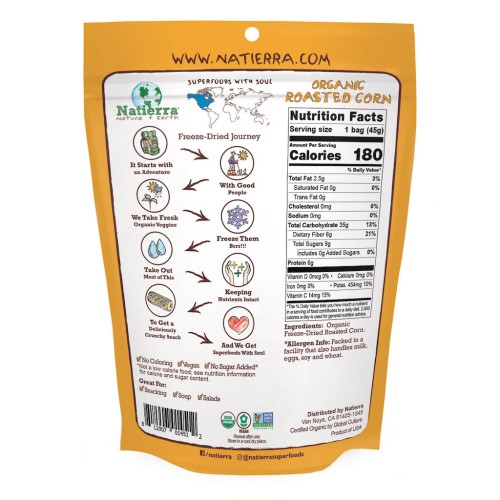 Weâre taking organic roasted corn on a freeze-drying adventure, to deliver the crunchiest and oh so yummy corn that have kept all of its essential nutrients. Weâve selected the ripest and tastiest corn to bring you this delicious snack. Enjoy Natierra® Superfoods with Soul!