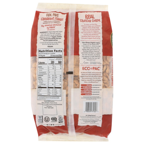 Our Flax Plus Cinnamon Flakes are crunchy, organic cereal flakes, made from whole grains and flax seed, and coated in cinnamon. We're big fans of flax seed, because of ALA Omega-3s that have been shown to support heart health. And with 10g whole grains and 4g of fiber per serving, this delicious cereal helps you start your day right. When you choose to eat organic, you're choosing health, for both you and the planet. Our unique EcoPac is a larger, recyclable bag without the box, which helps us to eliminate unnecessary waste, and allows us to pass the savings on to you, offering you the best value for money.