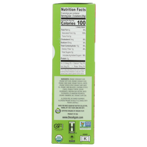 Introducing organic and gluten-free cinnamon graham crackers. Crafted with real cinnamon, these wafers are the perfect snack. Enjoy them on their own for a satisfying crunch, build epic treats like s'mores, create delicious pie crusts, or pair with Once Again spreads for a yummy plant-based snack!