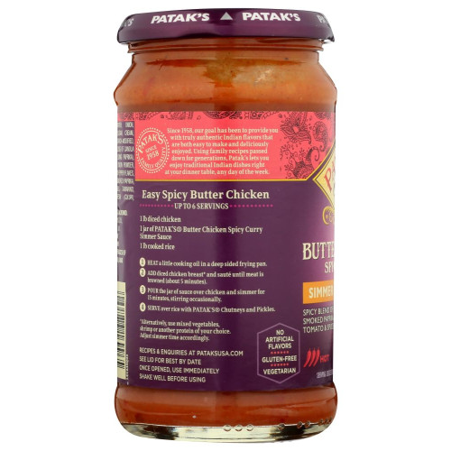 The Spicy Butter Chicken is a Stunning Product of the Patak Grocery Collections. looks so good on the outside, it will make you feel good inside. it is a good quality product. Authentic Indian Paste used for cooking.