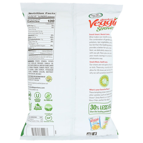 What makes Garden Veggie Snacks® Garden Veggie Straws® irresistible? Itâs the uniquely delicious taste of potatoes, tomatoes, and spinach made into a straw shape that is airy, crunchy, band fun to eat. Topped with the right amount of sea salt, our craveable straws will make your taste buds happy. Garden Veggie Straws® do not contain artificial preservatives or flavors and have 30% less fat than the leading potato chip