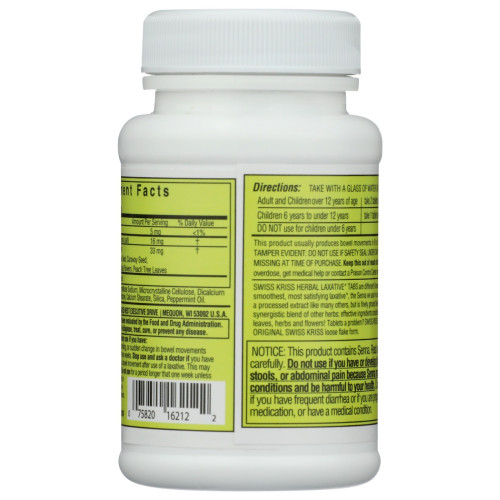 These Swiss Kriss Herbal Laxative Tabs are naturally different. Known world-wide as the smoothest, most satisfying laxative, Swiss Kriss Tabs are 100% natural, contain no harsh synthetic drugs. Effective ingredients consist entirely of nature's own sun-dried leaves, herbs and flowers.