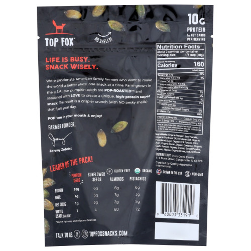 Discover a zesty kick with Top Fox Snacks' Pop-Roasted Chile Lime Pumpkin Seeds. Bursting with bold flavors, these seeds are a tantalizing blend of bold chile flavor and citrusy goodness!
