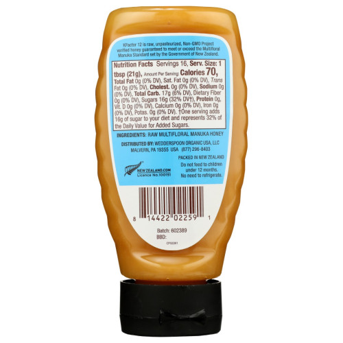 The original functional food. Unpasteurized, raw and delicious, this Non-GMO Project Verified superfood is sourced exclusively from New Zealand and is a multitasking superfood. Every jar is sourced, packed and sealed in New Zealand for the ultimate in quality and transparency. KFactor 12 Multifloral Manuka Honey is guaranteed to meet or exceed the Multifloral Manuka Standard from the New Zealand Government.