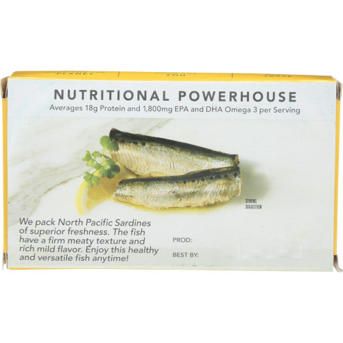 Responsibly Harvested:Â Selectively caught by fisheries targeting free-swimming schools of sardines. A great way to eat lower on the food chain. Recyclable packaging.